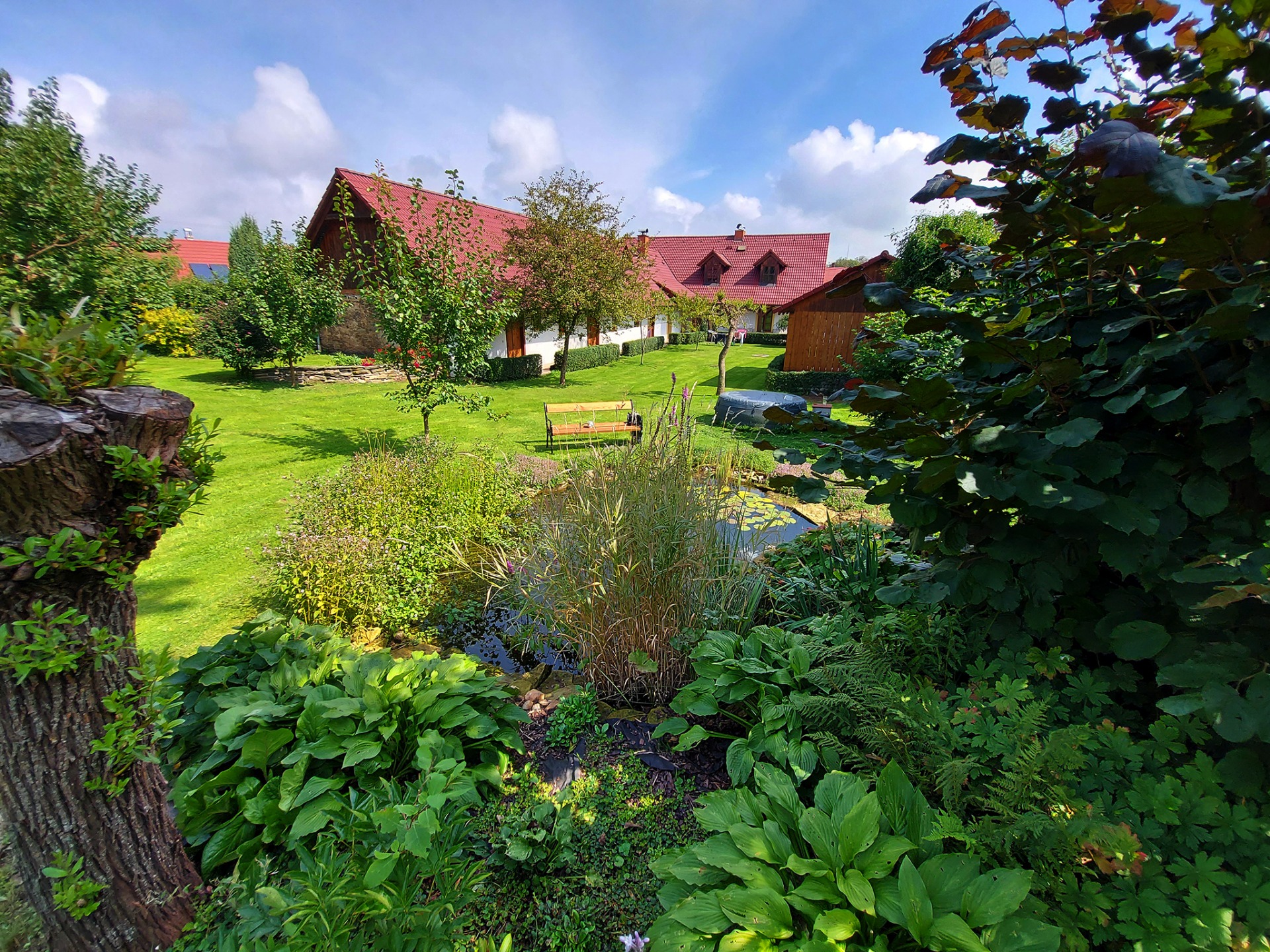 Nemovitost navazuje na pozemky, které jsou využívány z části jako užitkové a z části jako okrasné. V pozemku je vybudováno okrasné jezírko 12m2 s hloubkou až 180cm s filtrací, UV dezinfikací, s čištěním filtru opačným průplachem na pozemek a s potokem, který má cca 3metry. Jezírko je napájeno vodou ze střechy stodoly a dovedeno cca 50m potrubím do rybníčku pro výměnu vody. Jezírko i splav je navíc osvětlen.