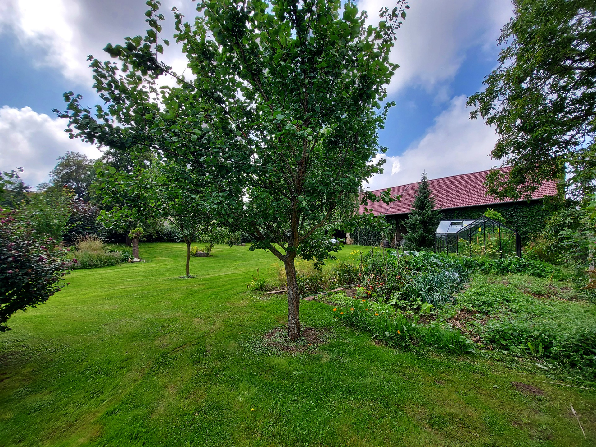 V tomto prostoru je zasazeno 10 nových stromků - broskvoně, višně, kdouloň, hrušeň. Jsou zde udržované záhony pro samostatné pěstování zeleniny pro čtyřčlennou rodinu. Rostou zde i růže a jiné okrasné či solitérní trvalky. U plotu rostou keře stínící pohledy od sousedů (i když jsou velmi milí a přátelští).