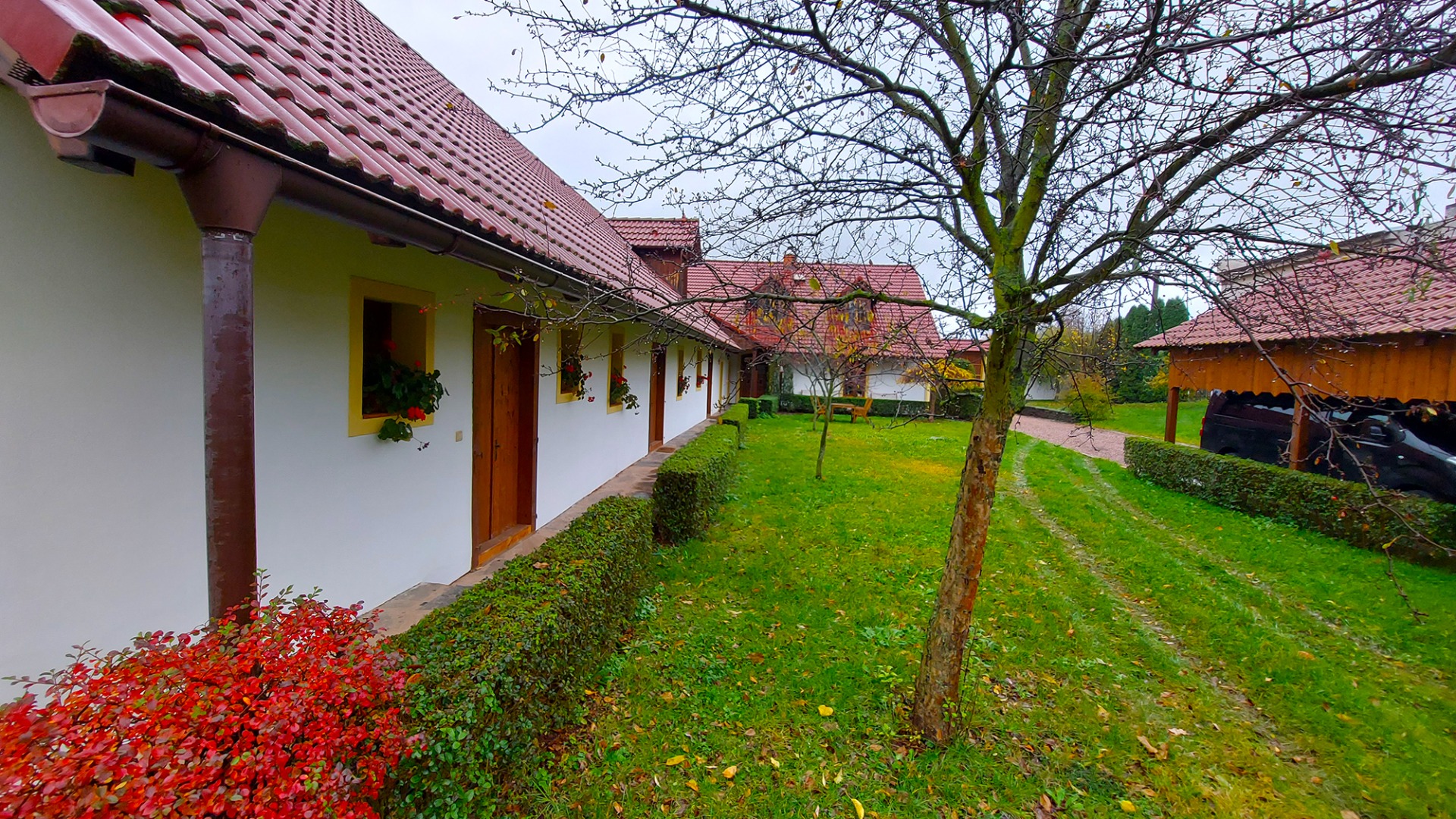 Veškeré tesařské prvky i ty venku - krokve, sloupy, stropní povaly jsou opracovány tesařskou technikou (tesařská sekera, poříz), žádné broušení, hrany ozdobně sražené a konce se zdobnými prvky.